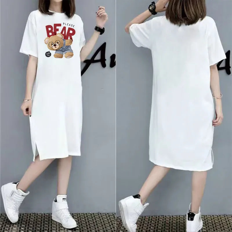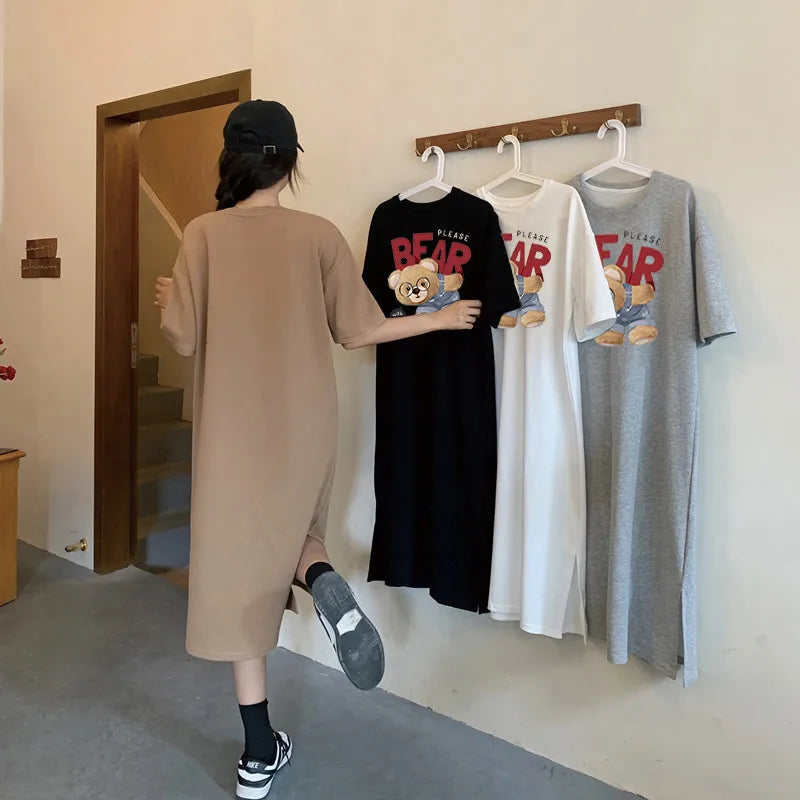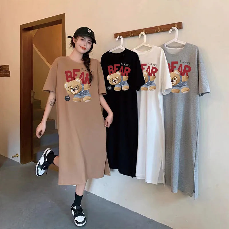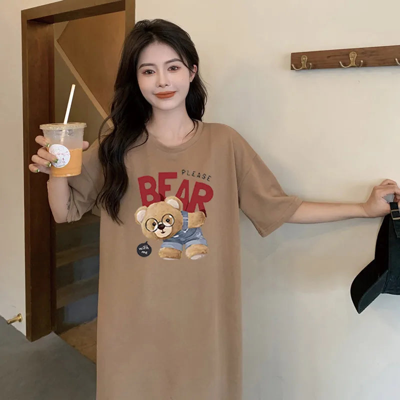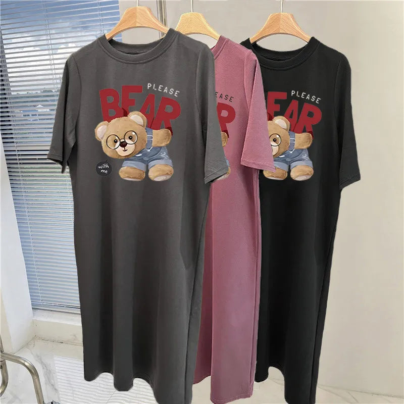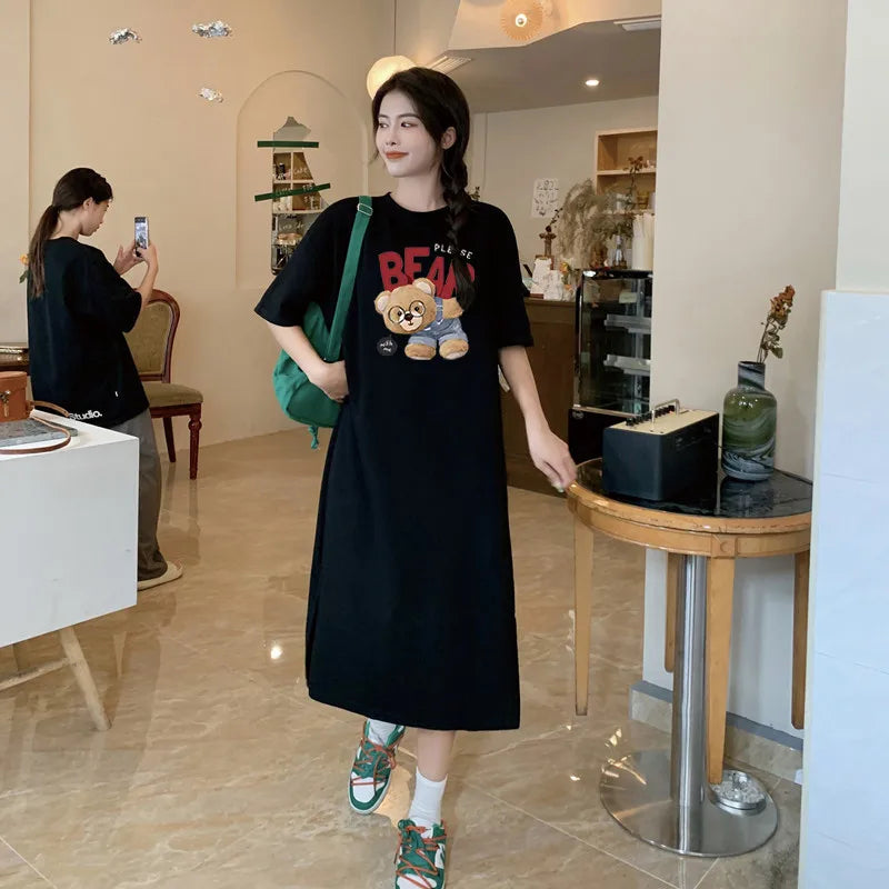 Cartoon Bear Print Short Sleeve Summer and Autumn New Loose Round Neck Pregnant Woman Comfortable Dress