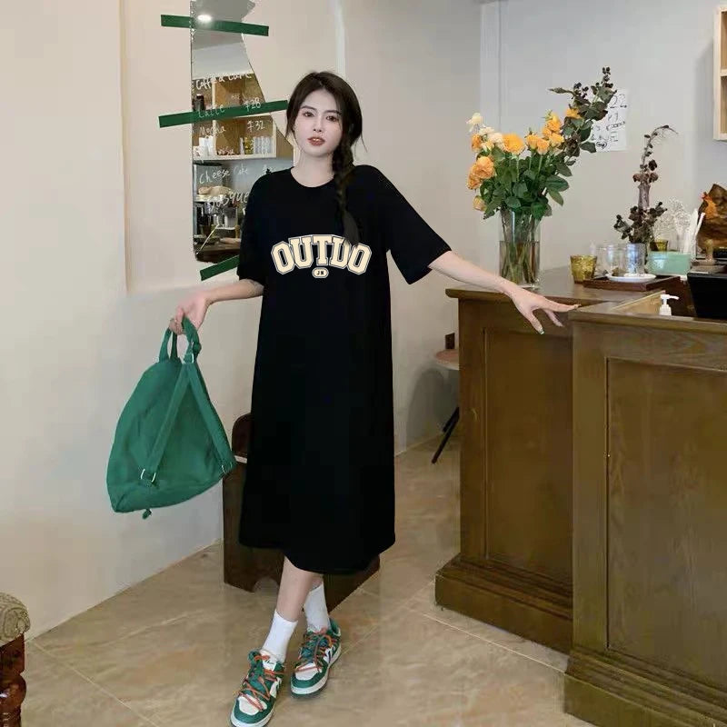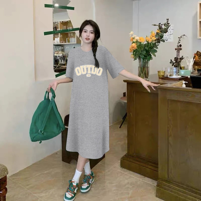 Korean Version Loose Casual Short Sleeved Dress Cute Letter Print Women's Round Neck Mid Length Skirt