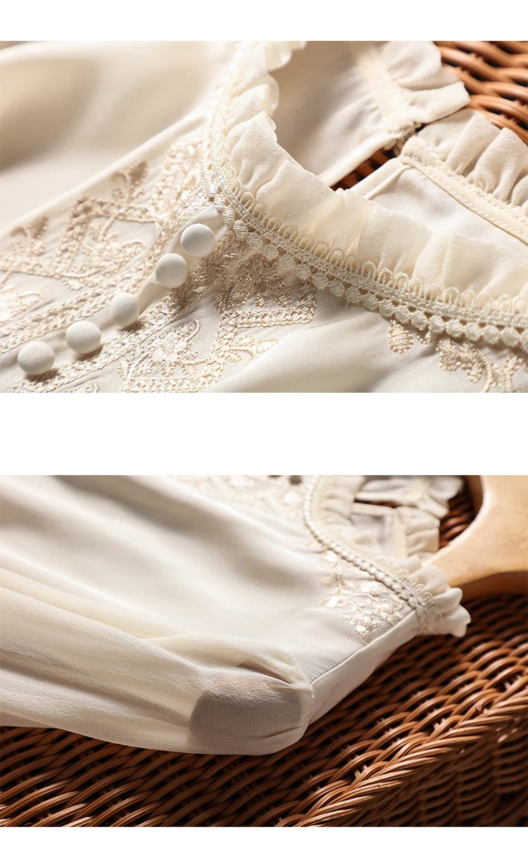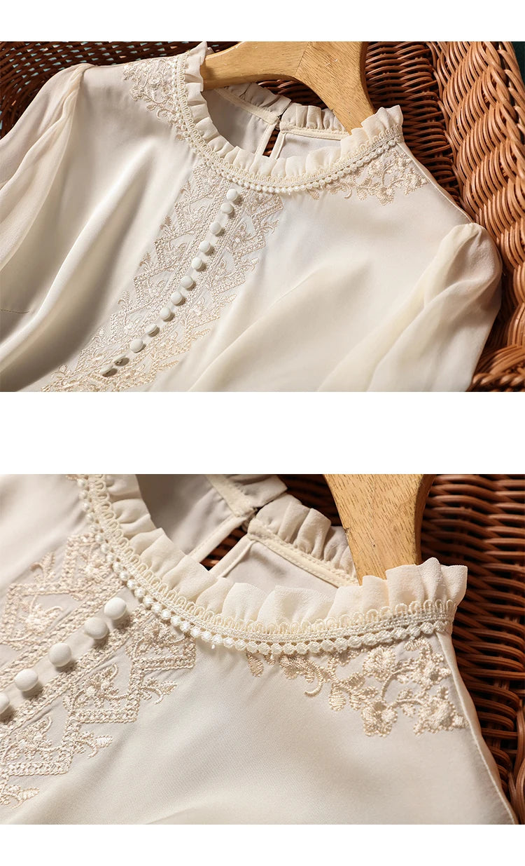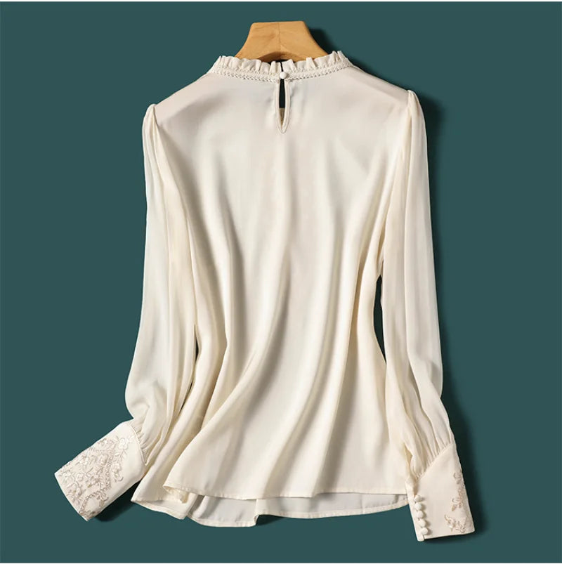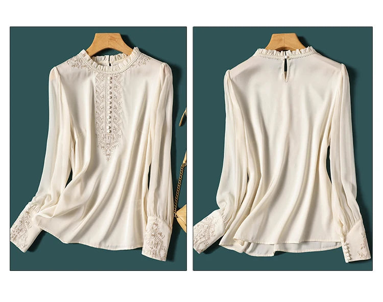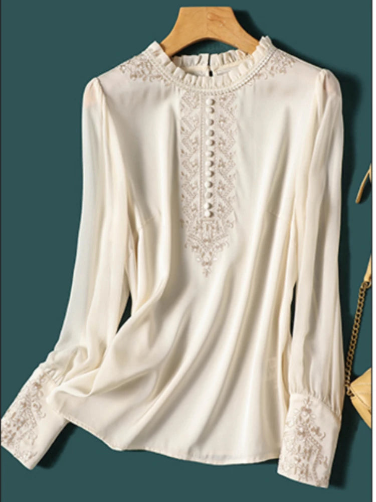 Silk Women's Blouses 2023 Spring Autumn Print Long Sleeve Shirts Loose Korean O-Neck Lace Top New Casual Clothing