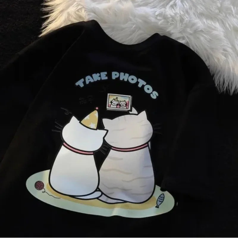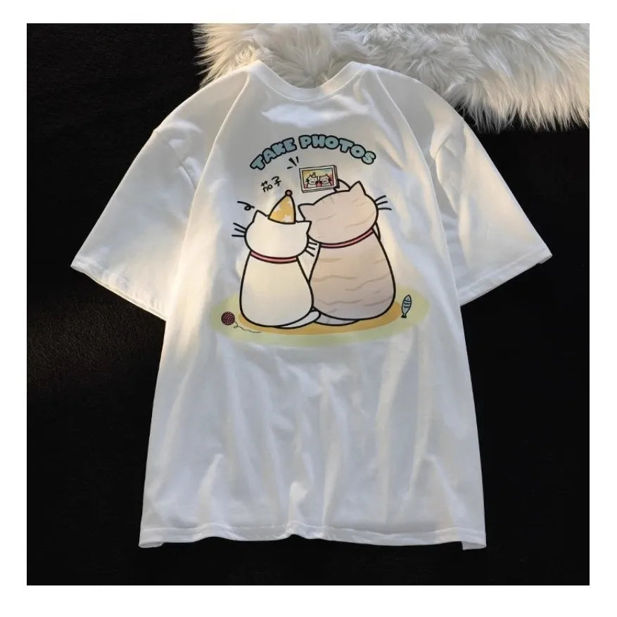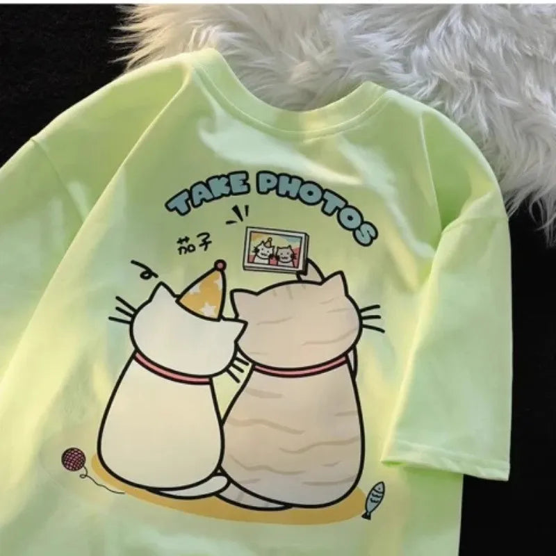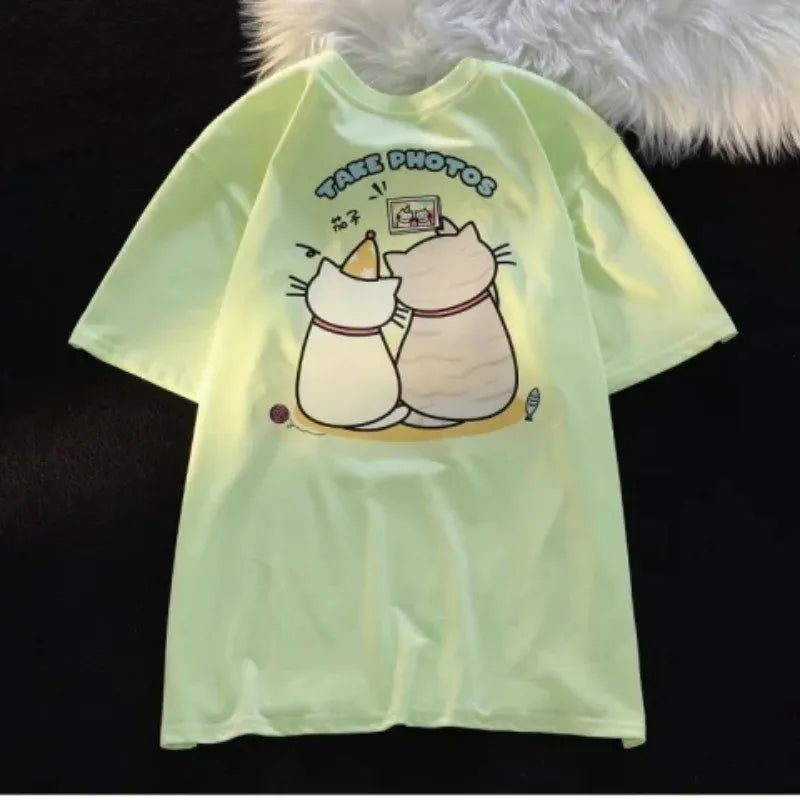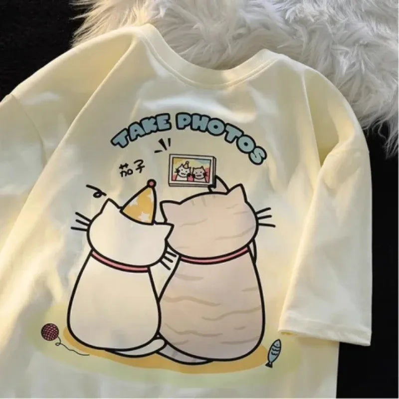 Summer Cartoon Two Cats Cute Printed Short Sleeve T-shirt Loose Fashion Fashion Men and Women with The Same Crewneck Top