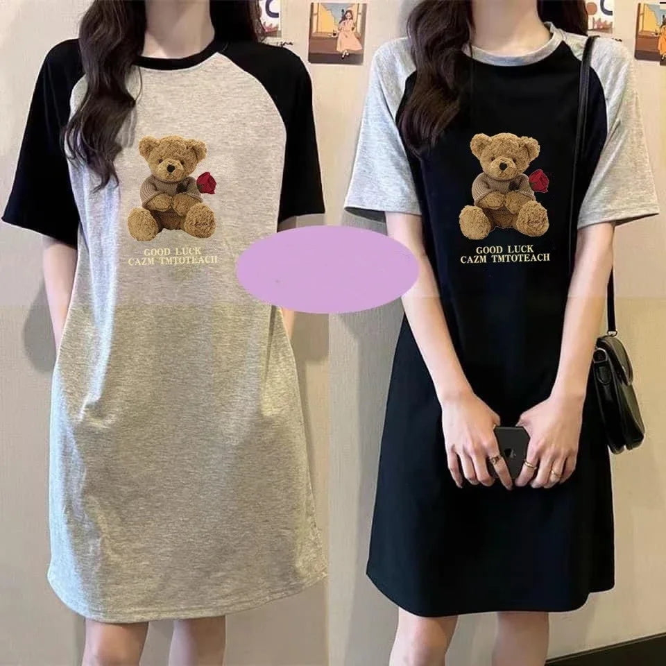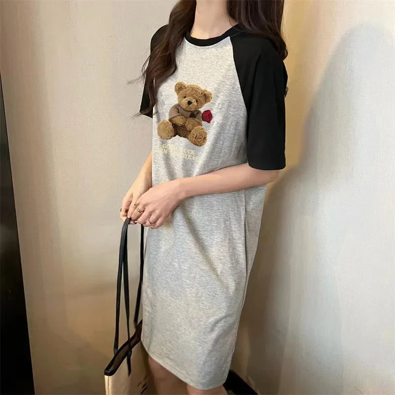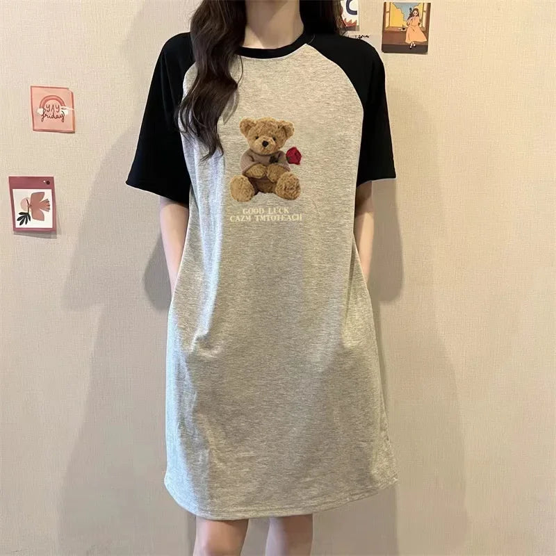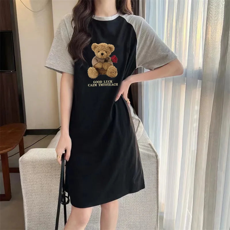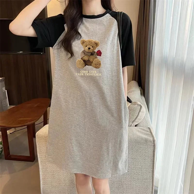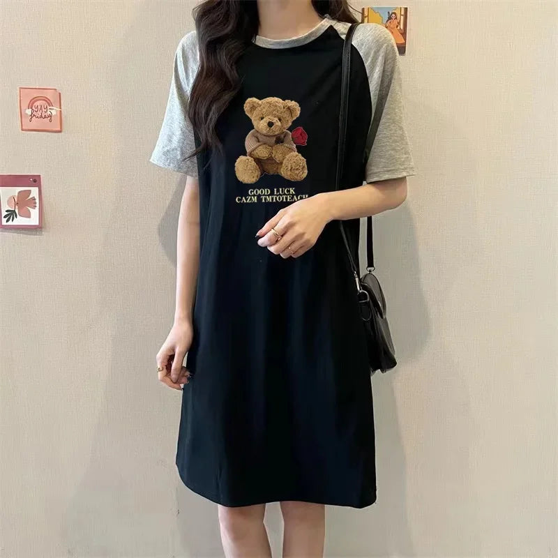 Summer Loose and Trendy Cartoon Rose Bear Print Dress for Pregnant Women in Korean Style, Simple and Casual Round-neck Dress