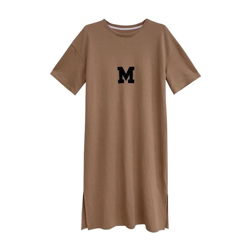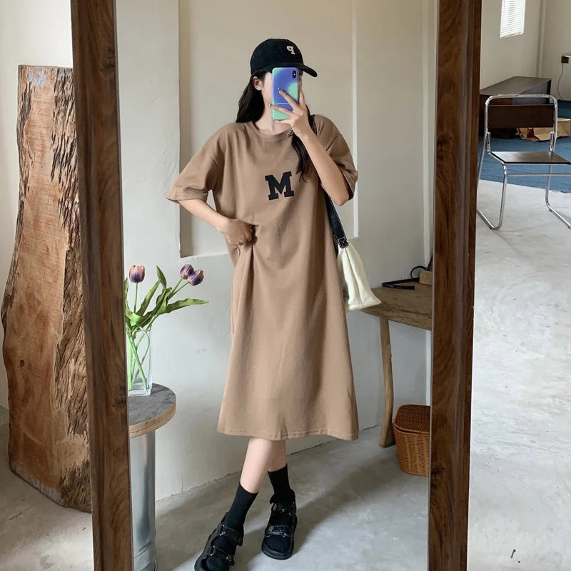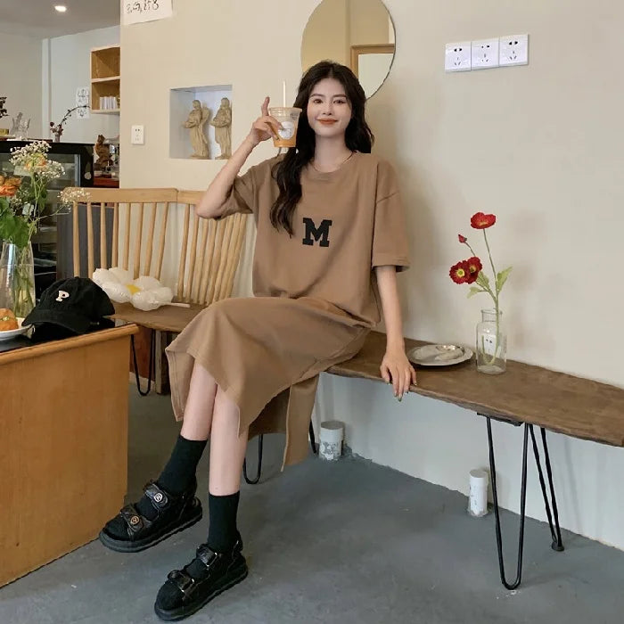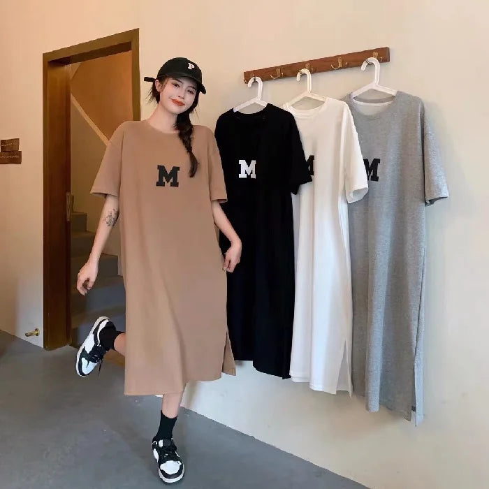 Summer Loose Letter Print Women Pregnant Korean Style Fashion Simple Casual Crew-neck Slit Dress