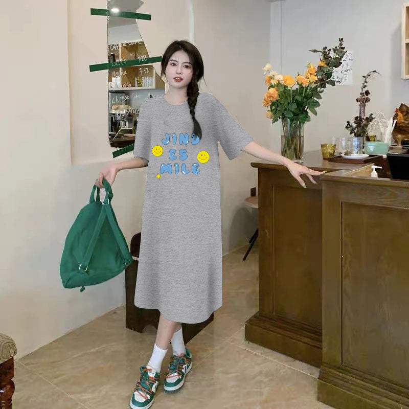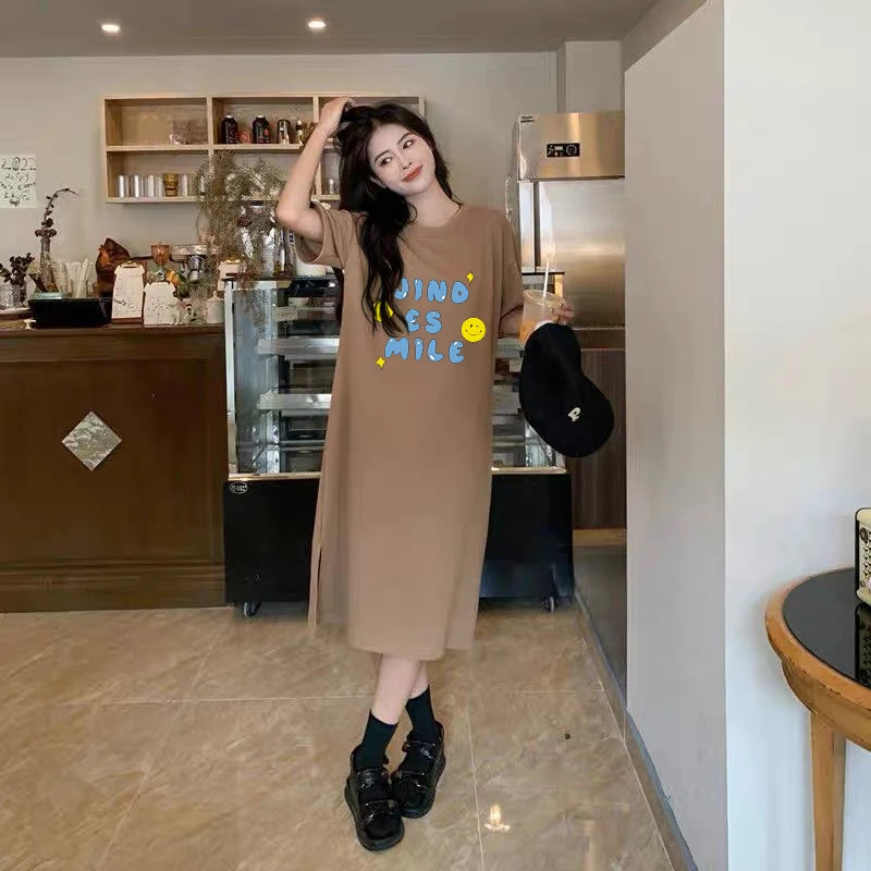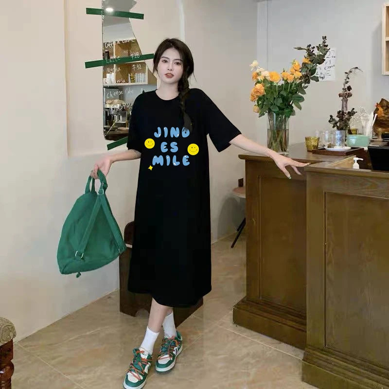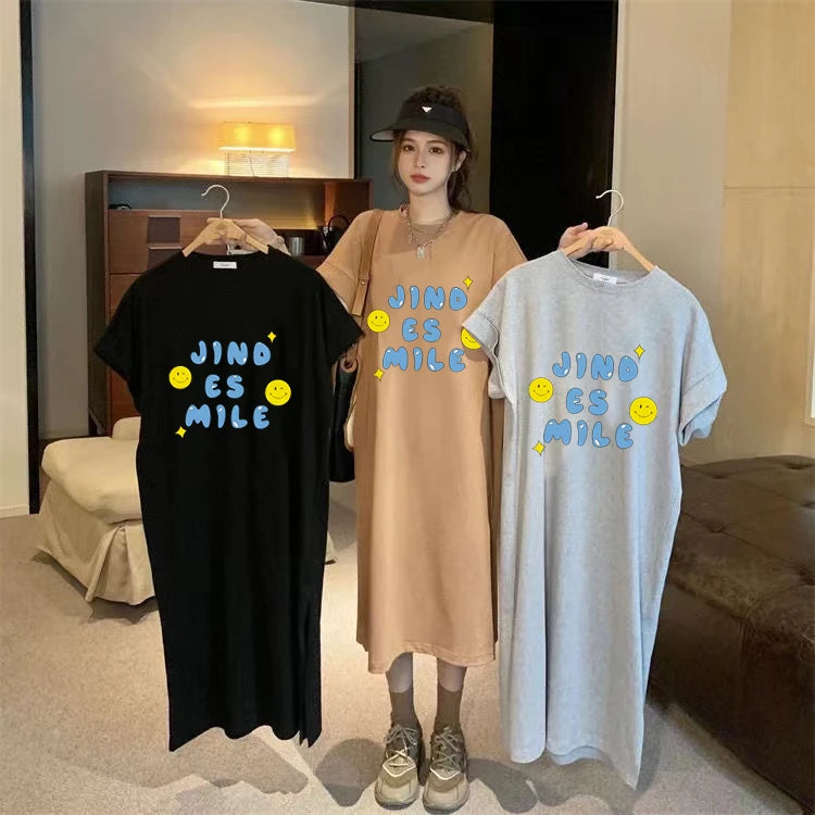 Summer New Korean Style Fashion Plus Size Women Split Printing T-shirt Long Dress Long Below The Knee Girls' Dress